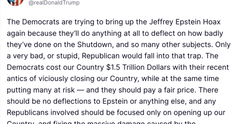 “The Democrats are trying to bring up the Jeffrey Epstein Hoax again because they’ll do anything at all to deflect on how badly they’ve done on the Shutdown, and so many other subjects. Only a very bad, or stupid, Republican would fall into that trap,” Trump said on Truth Social.
