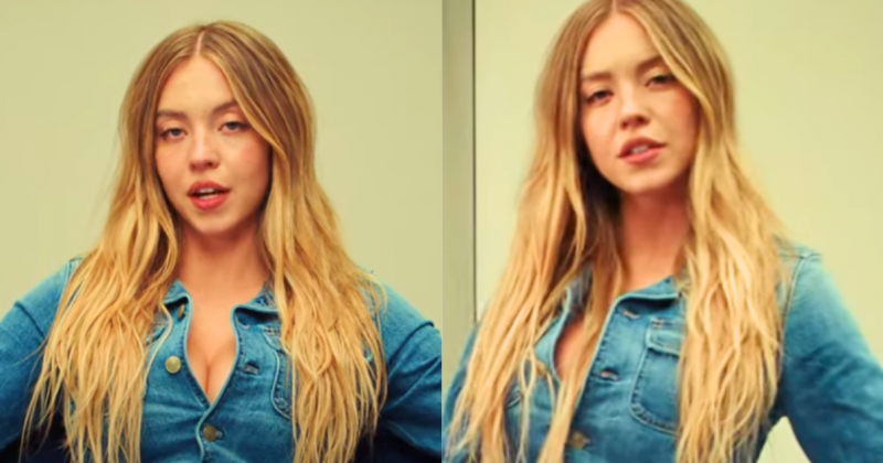 The narrator adds a voiceover line: “Sydney Sweeney, has great jeans.”