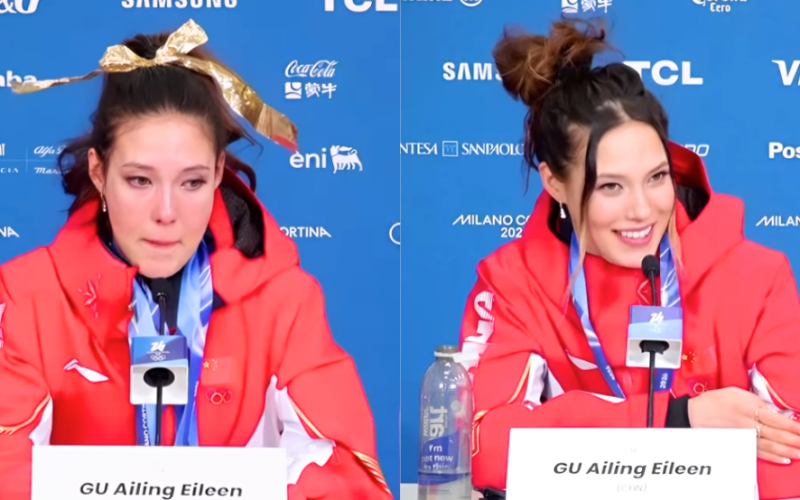 Eileen Gu arrived late to her post-competition press conference at the Milan Cortina 2026 Winter Olympics on Sunday, and the reason had nothing to do with skiing.