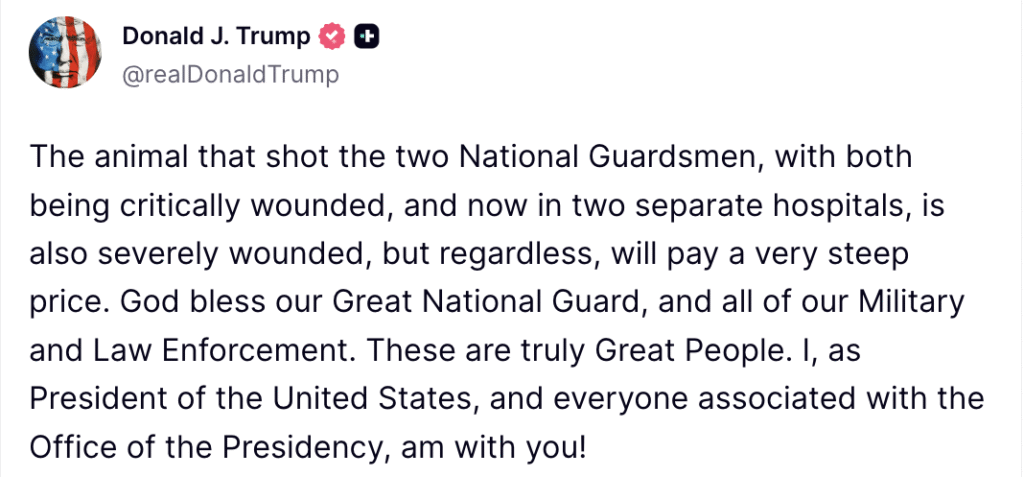 “The animal that shot the two National Guardsmen, with both being critically wounded, and now in two separate hospitals, is also severely wounded, but regardless, will pay a very steep price. God bless our Great National Guard, and all of our Military and Law Enforcement. These are truly Great People. I, as President of the United States, and everyone associated with the Office of the Presidency, am with you!” Trump wrote.